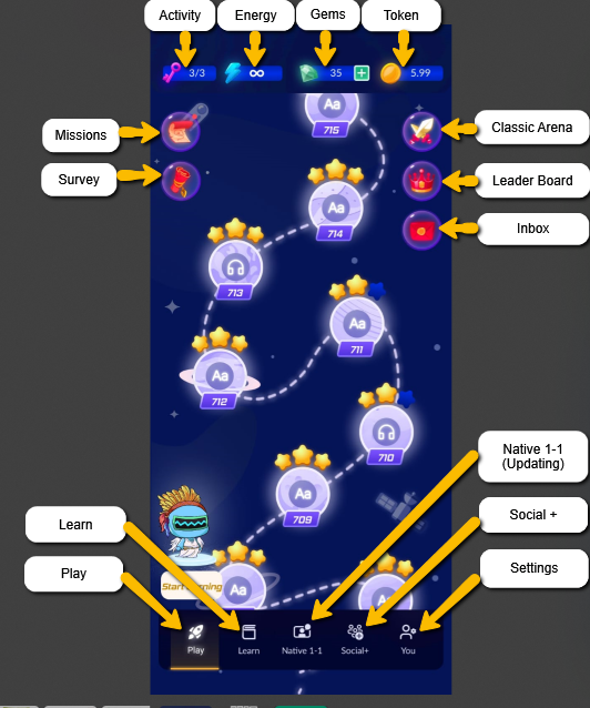 Pada gambar dibawah, menampilkan 5 bagian pembelajaran: PLAY, LEARN, NATIVE 1-1, SOCIAL +, YOU